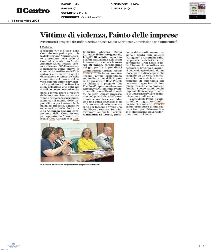Cresce l’attenzione intorno al progetto della Commissione Pari Opportunità regionale, “On the Road”, approvato dalla Commissione e già riconosciuto come esempio virtuoso di innovazione sociale, anche oltre i confini regionali, mediante il suo recepimento da parte della Commissione Pari Opportunità della Regione Molise